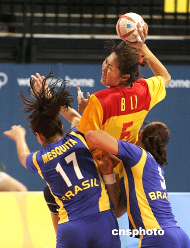 中新社雅典八月二十三日電 中國女子手球隊今天在最后一場小組賽中以二十八比二十三戰(zhàn)勝巴西隊,四戰(zhàn)兩勝兩負積四分名列小組第三位,進入八強。