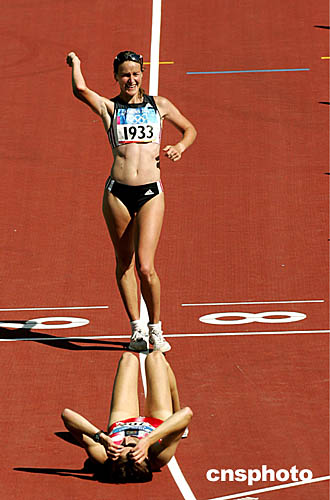 圖為在當(dāng)?shù)貢r(shí)間8月23日舉行的女子20KM競(jìng)走比賽后,德國(guó)選手Melanie Seeger和白俄羅斯選手Margarita Turova有人歡喜有人憂。