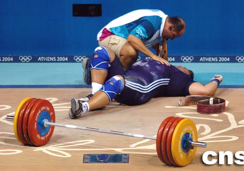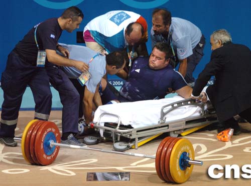 在當?shù)貢r間8月25進行的男子舉重比賽中,挪威選手因為失誤膝蓋受到傷害,被救護人員抬上擔架。