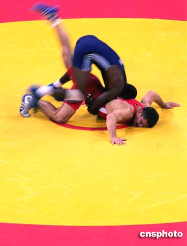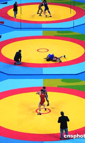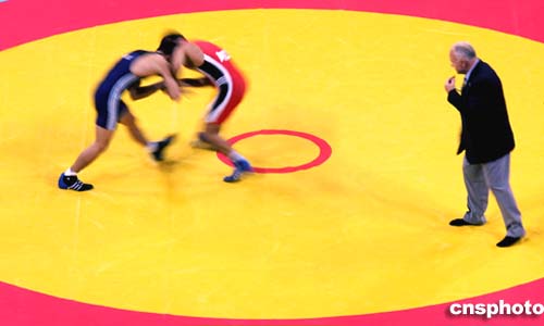 圖為當?shù)貢r間8月25日進行的男子六十公斤以下級摔交比賽現(xiàn)場。