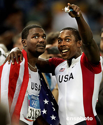 圖為美國選手加特林(Justin Gatlin )和克勞福德(CRAWFORD Shawn)在百米賽后看記分牌的鏡頭。