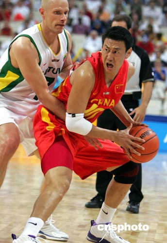 當(dāng)?shù)貢r(shí)間8月26日下午,雅典奧運(yùn)會(huì)男籃八強(qiáng)賽開戰(zhàn),暴冷闖入八強(qiáng)的中國(guó)男籃經(jīng)過(guò)頑強(qiáng)抵抗,終因?qū)嵙Σ粷?jì)而以75比95負(fù)于世界勁旅立陶宛隊(duì)。姚明發(fā)揮出色,多次扣籃成功,砍下全隊(duì)最高的29分。中新社記者:任晨鳴