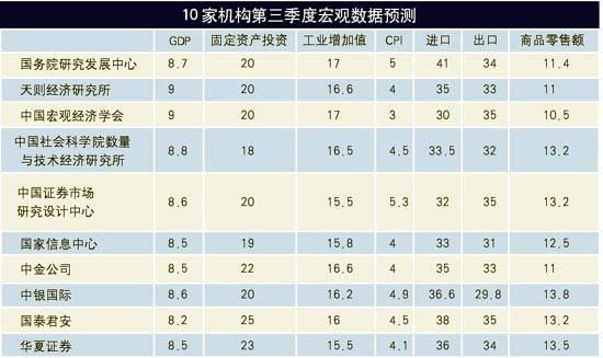 隨著國(guó)家統(tǒng)計(jì)局上半年以及7月份宏觀經(jīng)濟(jì)數(shù)據(jù)的公布,關(guān)于下半年宏觀經(jīng)濟(jì)走勢(shì)的判斷又一次成為關(guān)注的焦點(diǎn)。尤其是7月份消費(fèi)價(jià)格指數(shù)同比上漲5.3%,更是讓大家對(duì)央行是否加息產(chǎn)生了新一輪爭(zhēng)論。正由于此,《證券市場(chǎng)周刊》匯總了十家權(quán)威機(jī)構(gòu)對(duì)三季度各項(xiàng)主要宏觀數(shù)據(jù)的預(yù)測(cè)和經(jīng)濟(jì)學(xué)家們對(duì)于是否應(yīng)該加息的看法。