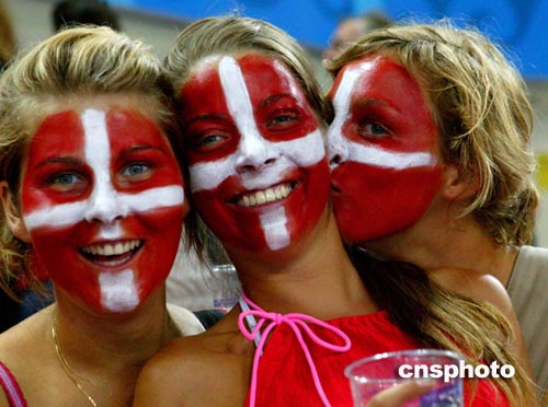 在當?shù)貢r間8月26日晚舉行的奧運會女子手球四分之一決賽上,丹麥女球迷將國旗畫在臉上為本國選手助威。中新社記者:王瑤