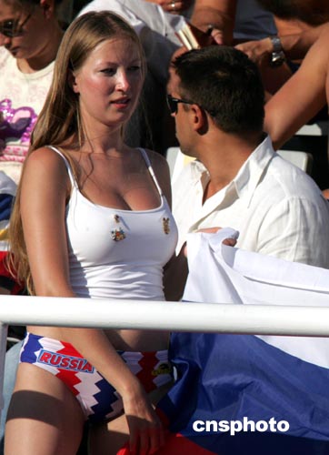 當(dāng)?shù)貢r(shí)間8月27日下午,雅典奧運(yùn)會男子水球比賽進(jìn)入白熱化階段,志在奪取金牌的俄羅斯隊(duì)(藍(lán)帽)以5比7負(fù)于匈牙利隊(duì),從而無緣金牌。俄羅斯的球迷人數(shù)雖少,但是熱情四射的女球迷依然奪人眼目。中新社記者:任晨鳴