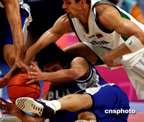 | 當(dāng)?shù)貢r(shí)間8月27日晚,進(jìn)入雅典奧運(yùn)會(huì)男籃半決賽的四只球隊(duì)捉對(duì)廝殺。不可一世大有非冠軍莫屬的立陶宛眾球星,遇上更加神勇的意大利隊(duì)。雙方在快攻中展開三分球大戰(zhàn),結(jié)果以三分球準(zhǔn)確而著名的立陶宛35投僅15中,意大利卻28投18中。意大利5號(hào)BASILE投中11個(gè)三分球,砍下全場(chǎng)最高分31分。意大利終以100比91擊敗立陶宛晉級(jí)決賽,而決賽的對(duì)手是淘汰美國(guó)“夢(mèng)六隊(duì)”的阿根廷隊(duì)。中新社記者:任晨鳴