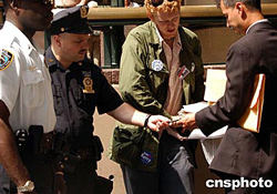 當(dāng)?shù)貢r(shí)間八月二十七日,距離美國(guó)共和黨大會(huì)開幕還有三天,紐約麥迪遜廣場(chǎng)花園附近已經(jīng)開始嚴(yán)密警戒,圖為一名年輕的布什反對(duì)者(右二)受到警察的盤查。作者:趙海燕