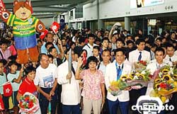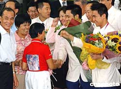 代表團今天中午返抵機場,雅典奧運贏得乒乓球男雙銀牌的高禮澤及李靜亦隨隊抵港,三百多名熱愛乒乓球的小朋友,獲安排到機場迎接,高禮澤及李靜的父母,以及民政事務局長何志平、康文署長王倩儀等官員,亦到機場迎接。