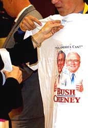 美國(guó)共和黨大會(huì)當(dāng)?shù)貢r(shí)間八月三十日至九月二日在紐約舉行,會(huì)場(chǎng)里出售的印有布什和切尼肖像的文化衫成為搶手貨。作者:趙海燕