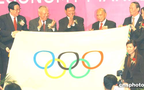 第八屆北京香港經(jīng)濟合作研討洽談會暨奧運經(jīng)濟市場推介會9月2日在香港會展中心開幕﹐北京市市委書記劉淇與市長王歧山﹑全國政協(xié)副主席霍英東﹑香港特首董建華﹑香港中聯(lián)辦主任高祀仁共同打開2008年在北京舉辦的第29屆奧林匹克運動會會旗。作者:趙振清