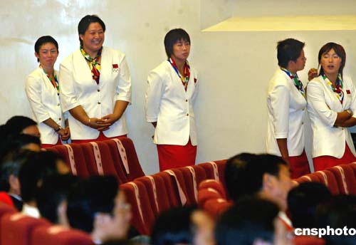 九月二日,中國國家體育總局在北京人民大會堂舉行第二十八屆奧運會中國體育代表團表彰大會。除三十二塊金牌得主外,孫福明(左二)等摘取奧運會銀、銅牌的運動員同樣受到多種嘉獎。中新社記者:鄭萍萍