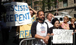 美東時(shí)間九月二日,美國(guó)總統(tǒng)布什來(lái)到紐約曼哈頓,準(zhǔn)備出席在這里舉行的共和黨全國(guó)代表大會(huì)閉幕式。當(dāng)總統(tǒng)車隊(duì)經(jīng)過(guò)被全線封鎖的市中心街道時(shí),路邊一位婦人打著“支持布什”的標(biāo)語(yǔ)。但他身邊的男子展開(kāi)更寬大的橫幅,上書“法西斯分子該悔悟了”。作者:龔文謨