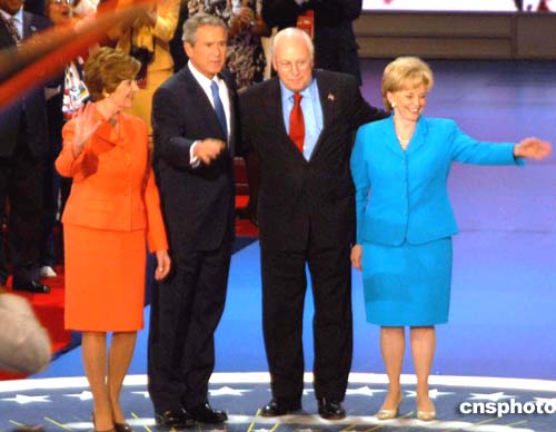 當(dāng)?shù)貢r間九月二日晚,美國總統(tǒng)布什在共和黨大會閉幕式上正式接受共和黨總統(tǒng)候選人提名后,與第一夫人勞拉以及美國副總統(tǒng)切尼夫婦一起向全場致意。作者:趙海燕