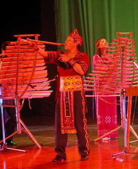 竹制樂(lè)器的演奏是越南藝術(shù)表演中獨(dú)具特色的,竹琴據(jù)介紹是仿鋼琴制成的,音色清脆,節(jié)奏明快,表演者的雙手在竹鍵上彈奏,速度快得讓觀眾眼花繚亂;德朗琴是用線將長(zhǎng)短不一的竹筒自上而下排掛在一個(gè)琴架上,敲擊琴筒的兩根細(xì)棒頂端各固定一個(gè)圓球,球上罩著一層布,敲擊竹筒時(shí)琴聲似幽谷回響;klong put琴由一排粗細(xì)有別的竹筒制成,演奏者根據(jù)每個(gè)竹筒的固定音調(diào),用手在筒端變換敲擊出舒緩綿長(zhǎng)的曲調(diào)來(lái);還有一個(gè)孔的簫,遠(yuǎn)遠(yuǎn)看去吹蕭人將蕭橫托在面前,用手在蕭的遠(yuǎn)端一開一合地掌握音階,仿佛中國(guó)蕭從小孔開合變換里發(fā)出的聲音,都從越南吹蕭人的手中魔幻般地變了出來(lái)。這些樂(lè)器既有獨(dú)奏,又有合奏,兼有表演的觀賞與聽覺(jué)的雙重效果,極具藝術(shù)魅力。