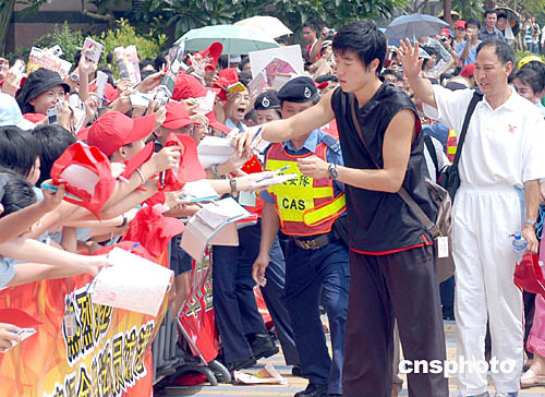 國(guó)家奧運(yùn)金牌代表團(tuán)9月7日在香港展開觀光之旅,金牌選手分別在香港多處名勝景點(diǎn)參觀,所到之處均深受廣大市民熱烈歡迎,在雅典奧運(yùn)勇奪田徑110米欄金牌的劉翔在尖沙咀星光大道參觀,并為小學(xué)生簽名留念。作者:鄧慶樂