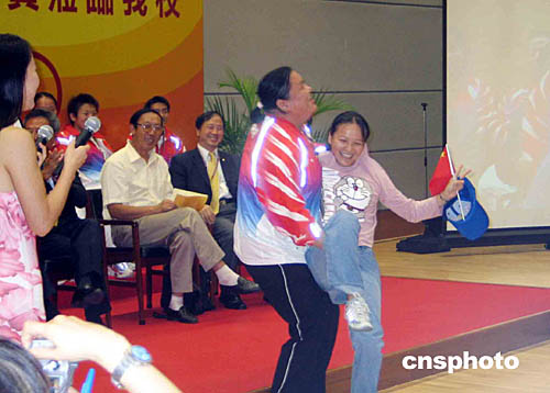 十多名中國奧運金牌運動員8日到香港中文大學訪問,七百多名師生出席歡迎活動。期間有學生要求女子75公斤舉重金牌得主唐功紅抱起她,引來全場哄動。作者:尹丹丹