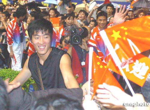 國家奧運(yùn)金牌運(yùn)動(dòng)員代表團(tuán)9月8日晚在香港跑馬地馬場(chǎng)參觀,“欄王”劉翔所到之處均受到熱烈歡迎。作者:趙振清