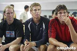 德國網(wǎng)球名將舒特勒(左一)、美國網(wǎng)球選手鄧特(左二)等在抽簽儀式上十分關(guān)注自己的對(duì)陣選手。中新社記者:盛佳鵬