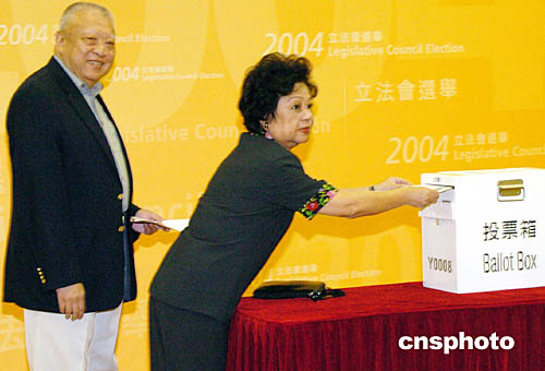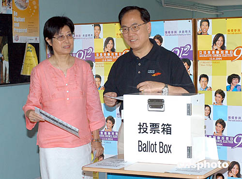 特區(qū)行政長(zhǎng)官董建華、政務(wù)司司長(zhǎng)曾蔭權(quán)、政制事務(wù)局局長(zhǎng)林瑞麟、民政事務(wù)局局長(zhǎng)何志平等政府高官今日一早紛紛到所屬選區(qū)投下莊嚴(yán)一票,以身作則一盡公民責(zé)任。