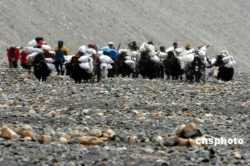 圖為在珠峰6500米處清掃的垃圾正由牦牛馱下山。作者:阿克布