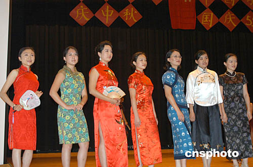 華盛頓的中國留美學生當?shù)貢r間九月十二日晚舉行聯(lián)歡會慶祝國慶55周年,歡度中秋佳節(jié)。這是女留學生表演的具有中國民族特色的旗袍秀。作者:余東暉