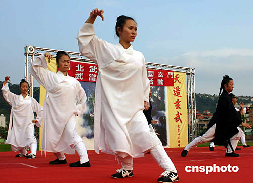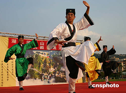 圖為臺(tái)灣武當(dāng)武術(shù)愛好者表演《太極五行拳》,與訪問團(tuán)切磋交流。