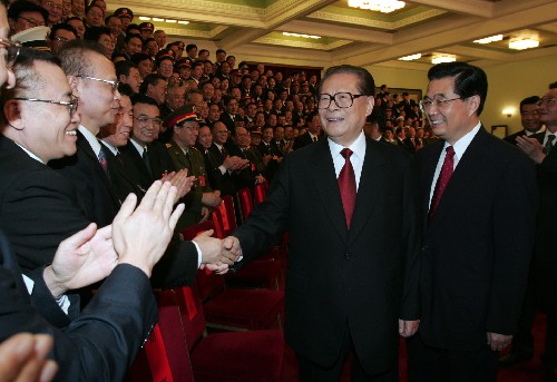 講話后,胡錦濤、江澤民親切握手,并向大家揮手致意,全場(chǎng)再次響起長(zhǎng)時(shí)間的熱烈掌聲。
