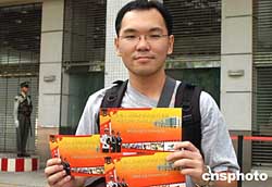 第一位領(lǐng)取參觀票的歐陽先生二十五日晚八時許就開始排隊,他準(zhǔn)備和父母一起去參觀。作者:梁永強