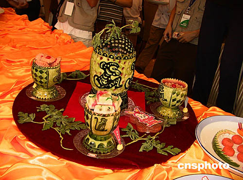 圖為平湖海天賓館的大廚們將瓜皮雕成的精美盛具