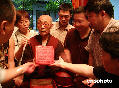 圖為廣德寺高僧向游人展示這一千年國寶。
