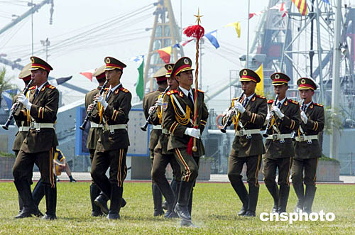 圖為駐軍三軍儀仗隊(duì)威武步操入場(chǎng)。
