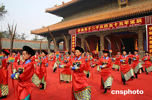 在祭祀孔子大典儀式上,曲阜當(dāng)?shù)匮輪T在大成殿前表演了大型祭孔樂舞。作者:鞠成利