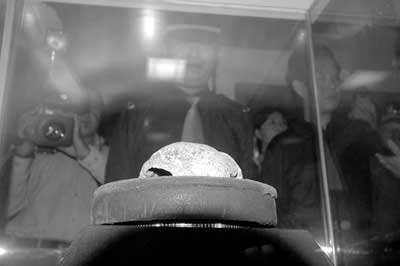 據(jù)北京娛樂(lè)信報(bào)報(bào)道,30日上午10時(shí)30分左右,在數(shù)名手持沖鋒槍的房山公安分局防爆隊(duì)隊(duì)員的嚴(yán)密監(jiān)視下,北京人頭蓋骨枕骨化石從中科院安然運(yùn)抵周口店北京人遺址博物館,被安放在防彈玻璃罩中展出,這次展出將持續(xù)到10月14日。