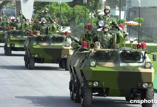 上午,當(dāng)澳門(mén)特別行政區(qū)行政長(zhǎng)官何厚鏵、澳門(mén)中聯(lián)辦主任白志健和多位特區(qū)政府官員及社會(huì)各界人士進(jìn)入營(yíng)區(qū)時(shí),受到駐澳門(mén)部隊(duì)司令員劉聯(lián)華少將、政治委員楊忠民少將等駐軍官兵熱烈歡迎,特首與市民興致勃勃觀看了升國(guó)旗儀式、儀仗隊(duì)隊(duì)列操槍、刺殺團(tuán)體操、裝甲車(chē)縱隊(duì)行進(jìn)等軍事科目表演,官兵精湛的軍事技術(shù)、良好的精神風(fēng)貌,贏得了澳門(mén)市民的陣陣掌聲。