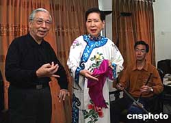 年過(guò)七旬臺(tái)灣人申陳曼麗女士(中),新近落戶上海,并在家中學(xué)京劇一絲不茍,“家教”老師是京劇大師梅蘭芳的入室弟子舒昌玉(左)。十月八日,申陳曼麗將在上海逸夫舞臺(tái)舉行自己的演出專場(chǎng),上演梅派名劇、全本《玉堂春》。這位海外京劇名票粉墨登場(chǎng),吸引上海眾多戲迷捧場(chǎng)。作者:潘索菲
