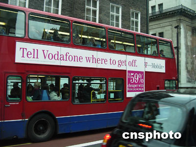 倫敦公交車車身上,赫然出現(xiàn)移動通訊運營商直接點名挑戰(zhàn)對手的廣告。余瑞冬 攝