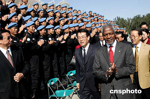 正在北京訪問(wèn)的聯(lián)合國(guó)秘書(shū)長(zhǎng)安南,十月十二日參觀公安部維和中心。中新社記者:毛建軍