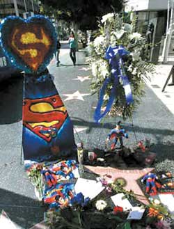 享年52歲的“超人”克里斯托夫·里弗墜馬癱瘓后對(duì)抗病魔的毅力與勇氣深植影迷心中,從10月11日開(kāi)始,在美國(guó)好萊塢星光大道上,人們駐足拍攝擺放在已故演員克里斯托夫·里弗名字前的照片、短信和鮮花。而當(dāng)年《超人》電影在紐約的拍攝景點(diǎn)——“超人”擔(dān)任記者的報(bào)社大樓,也有許多影迷前往憑吊。電影中,“超人”每天上班的報(bào)社“DAILYPLANETNEWS”所在的大樓,隨著電影的走紅而有了“超人大樓”的稱(chēng)號(hào),所以在克里斯托夫·里弗過(guò)世的消息傳出后,紐約人紛紛來(lái)到這里懷念心中的偶像。一名紐約影迷說(shuō):“這是‘超人’大樓,大家都會(huì)來(lái)這里看有名的地球標(biāo)志,這同時(shí)也是新聞大樓,是有名的觀光景點(diǎn)。”