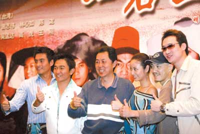 《一石二鳥》是今年明星陣容非常強(qiáng)的賀歲搞笑片。吳宗憲、林心如、雪村、陳龍、吳孟達(dá)、曾志偉、高虎,7位內(nèi)地、香港、臺灣的大腕明星都在片中有精彩表演。正像雪村昨天在發(fā)布會上所說的,這部片子是個純粹的商業(yè)電影,“就是沖著錢去的!痹趹蛑校緛砭陀邢矂⌒Ч难┐宕┥狭穗y得一見的古裝戲服,頭發(fā)也被設(shè)計成了雷震子的發(fā)式,更大膽使用鐵鍬作為自己的防身武器,實(shí)在是搞笑得不得了。而吳宗憲更是與林心如大演親熱對手戲。