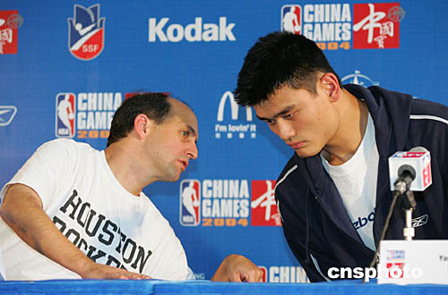 坐在一邊的姚明此時興致勃勃地接了下茬:“這一點上我覺得杰夫(范甘迪)可以和中國隊的主教練哈里斯交流一下”。范甘迪反問姚明“他中文說得好嗎”,姚明笑著耳語道“也不怎么樣”,話音通過麥克風傳出,范甘迪得意地大笑,記者們也被這一老一少調(diào)侃逗樂了。