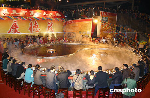 在有“天下第一大鍋”之稱的德莊大火鍋前,人頭攢動(dòng),熱鬧非凡,上千斤火鍋底料熬出的湯汁濃香撲鼻,讓人垂涎。重慶市人民政府副市長謝小軍在開鍋點(diǎn)火儀式上說,這天下第一大鍋有五十六個(gè)座位,象征著五十六個(gè)民族齊聚火鍋之都,品嘗這一山城美食。
