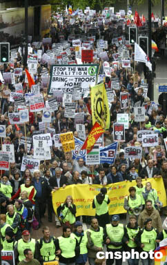 來自英國各地和歐洲大陸的數(shù)萬民眾10月17日在倫敦市中心舉行反戰(zhàn)示威游行,呼吁美英軍隊結(jié)束對伊拉克的“非法占領(lǐng)”。