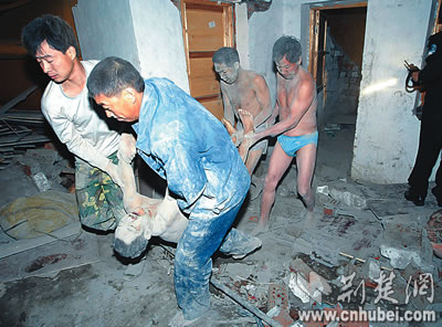 報道稱,工棚內(nèi)住有民工23人,早已熄燈睡覺。巨響之后,工棚內(nèi)立即傳出呼救聲。未被砸中的工人渾身是灰逃出來后,又折轉(zhuǎn)身去救人。因工棚配電箱被砸,他們摸黑搜索,搬開瓦礫救人,先后用雙手刨出5名工友。