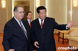 全國(guó)政協(xié)主席賈慶林,十月二十五日在北京人民大會(huì)堂會(huì)見葡萄牙議會(huì)外交與歐洲事務(wù)委員會(huì)主席雅伊梅·伽瑪率領(lǐng)的葡萄牙議會(huì)外委會(huì)代表團(tuán)。中新社記者:毛建軍