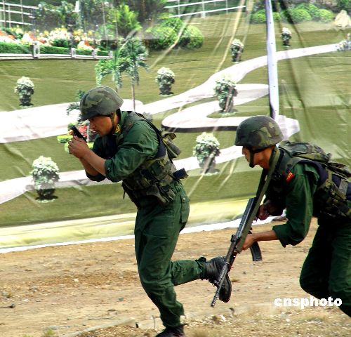 2004年10月25日,江蘇武警某部“反恐”分隊(duì)舉行“反恐”模擬演練,努力提高官兵在各種條件下處置突發(fā)事件能力。作者:王耀武