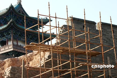 10月17日坍塌的山西平遙古城墻的修復工作于10月26日開始,城墻邊上的腳手架已經(jīng)開始建立,平遙文物局的工作人員已經(jīng)開始對城墻的基礎開始進行測量,同時,部分施工人員也于26日進駐工地。作者:魏駿