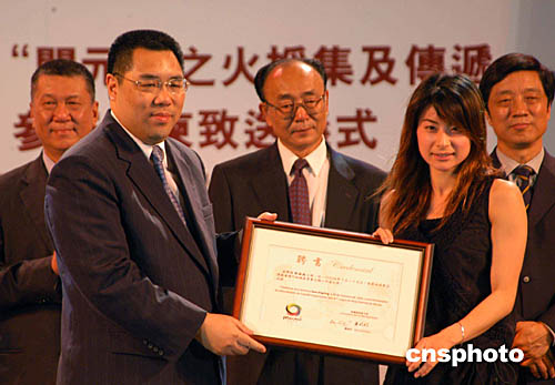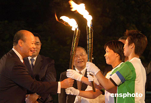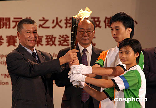 澳門特首何厚鏵在金蓮花廣埸接過中國雅典奧運(yùn)金牌得主勞麗詩和澳門運(yùn)動(dòng)員李廣祥傳遞的“開元”之火火炬