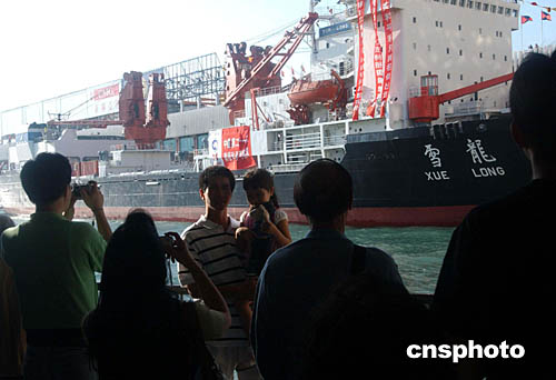 | 中國破冰船“雪龍?zhí)枴钡诌_(dá)香港補給并停泊在尖沙咀海運碼頭,這艘唯一能在極地航行的破冰船,冀三日的訪港活動,擴(kuò)闊港人視野!把?zhí)枴睂⒊掏蠘O挑戰(zhàn)南極的最高點,這將是中國人首次深入南極內(nèi)陸一千三百公里,創(chuàng)造中國南極考察史新紀(jì)錄。圖為10月30日大批香港市民前來圍觀“雪龍?zhí)枴逼票。作?尚金生