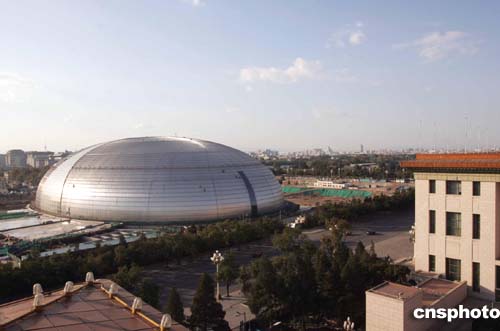 座落在北京人民大會(huì)堂西側(cè)的國家大劇院外部主體工程十月全部完工,開始內(nèi)部裝修施工階段,預(yù)計(jì)二零零五年秋季對(duì)外開放。作者:毛建軍