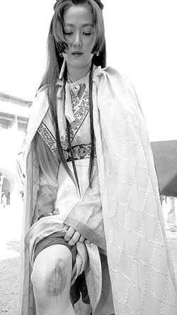 休息了一個(gè)小時(shí)后,王思懿又重新上馬繼續(xù)拍攝了,只是上下馬、走路時(shí)需要人攙扶著。而剛才還不省人事的王思懿跟沒(méi)事似的對(duì)記者做了個(gè)鬼臉,“騎馬要坐著,沒(méi)事的!倍稚先际莿偛趴呐隽粝碌膫。思懿大拇指骨節(jié)處一塊凸起引起了記者的注意,思懿指著手說(shuō),這是前不久拍舞刀戲時(shí),用力過(guò)猛,大拇指骨折留下的痕跡,現(xiàn)在還沒(méi)恢復(fù)。而話音未落,王思懿更撩起褲腿,膝部被一塊碗口大小的深紫血印整個(gè)覆蓋,真是慘不忍睹,“這是在拍攝一場(chǎng)打戲時(shí)腿部躲閃慢了一步,刀劈到腿上的結(jié)果。”思懿說(shuō),當(dāng)時(shí)疼得要命,整個(gè)膝蓋腫得老高,比這次還嚇人。不僅如此,因?yàn)橐╂z甲,思懿的腰上和肩上也磨出了一道道血印。不過(guò),當(dāng)被問(wèn)到苦不苦時(shí),思懿卻表示早已習(xí)慣了,“這點(diǎn)小傷不算什么,拍武戲哪有不受傷的,每次拍攝時(shí)都不覺(jué)得疼,只是回去洗澡時(shí)才發(fā)覺(jué):‘唉?怎么這么疼,全都破了!